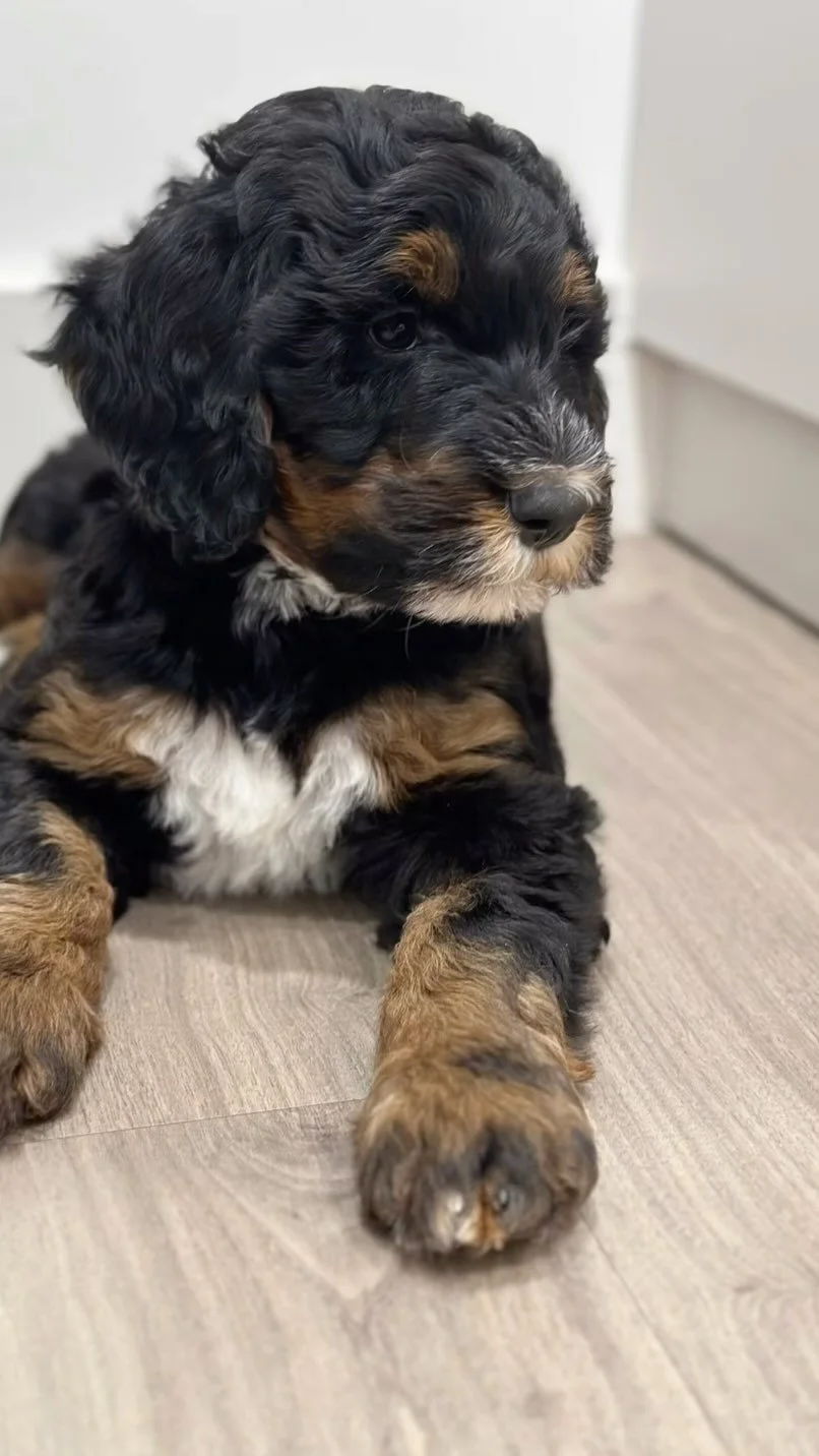 Why would you want to adopt a Bernedoodle? A Bernedoodle is a mix between a Bernese Mountain Dog and a Poodle. Both breeds are known for their intelligence, gentle demeanor, and loyalty. If you're looking for an intelligent dog that likes children and can also be trained easily, the Bernedoodle could be the perfect companion for you!